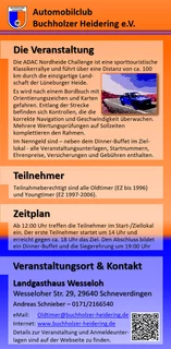 Mit dem Handling speziell der unterschiedlichen Bordkarten gab es einiges Durcheinander, wodurch wir uns entschieden haben, in 2026 die Sportliche Old-/Youngtimer Kategorie als eigene Veranstaltung auszukoppeln, jedoch auch weiterhin mit der Orientierungsveranstaltung als Kombiveranstaltung zu koppeln. Der neue Name der Klassiker-Rallye lautet "ADAC Nordheide Challenge". Alle fahren nach demselben Bordbuch und Bordkarte.