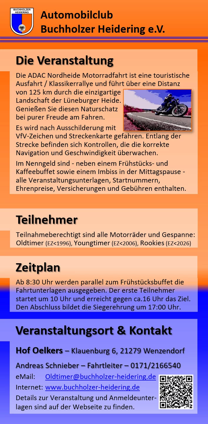 In 2026 wollen wir weiter auf das beliebte und in den Vorjahren bewährte Format aufsetzen und gleichzeitig den Weg, die Fahrten mehr und mehr den Bedürfnissen der Fahrer anzupassen, konsequent fortführen. Mit ständig wachsenden Teilnehmerzahlen bestätigen die Teilnehmer, daß wir hier auf dem richtigen Kurs liegen. Bei der "ADAC Nordheide Motorradfahrt" führen wir Wertungsprüfungen mit mehrfachen Meßpunkten durch.