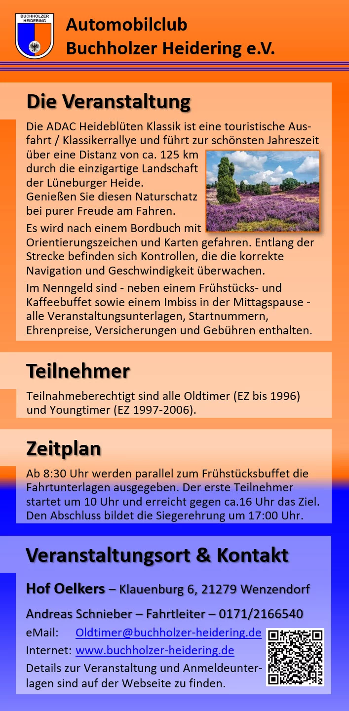 Ausschreibung, Online-Anmeldung und ein Nennformular zum Download finden Sie auf der rechten Seite verlinkt oder über das Menü unter Veranstaltungen. Für alle weiteren Fragen und Wünsche senden Sie bitte eine kurze Mail an Oldtimer@Buchholzer-Heidering.de.